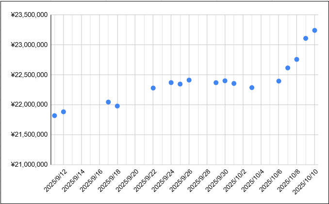 1カ月で100万円を超える増加は非常に嬉しい結果です。特に10月6日頃から資産が大きく上昇していることがグラフから見て取れ、この勢いが今回の大きな資産増につながりました。