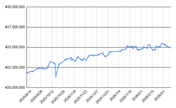 【ポイント】 視点を広げて2025年9月からの半年間を振り返ると、景色は一変します。当時は2,200万円に届かなかった資産が、約半年で約300万円も増加しています。10月に一度大きな落ち込みを経験していますが、そこを耐えて積立を継続したことが、現在の2,500万円近辺という「高い土俵」に繋がっています。