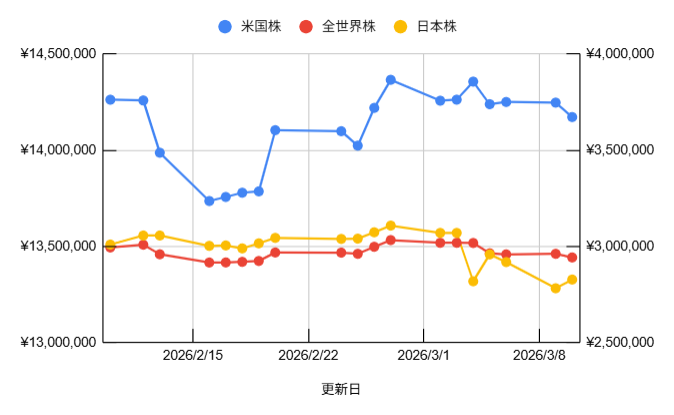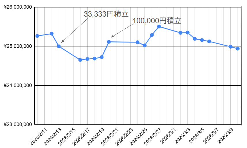 【コメント】 2月中旬から下旬にかけては、計133,333円の積立を行い一時的に資産が跳ね上がりました。しかし、3月に入ってから相場全体が軟調になり、直近では右肩下がりの推移を見せています。長期で見れば上昇トレンドの中の小さな押し目ですが、今は耐える時期と言えそうです。