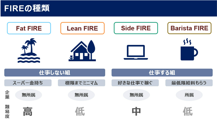 FIREには、主に以下の4つの種類があり、コムたろさんが選んだ「コーストFIRE」は、この分類の中では早期リタイヤはしないため4つのFIREよりもハードルが低いFIREになります。