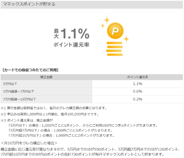 マネックスカードを使って積立を行うと、積立金額に応じて以下の還元率でポイントが付与されます。