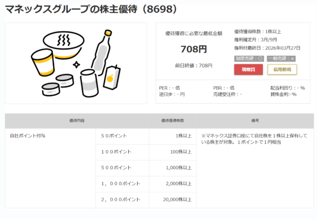 - マネックスグループの株主優待(1株保有):100pt / 年